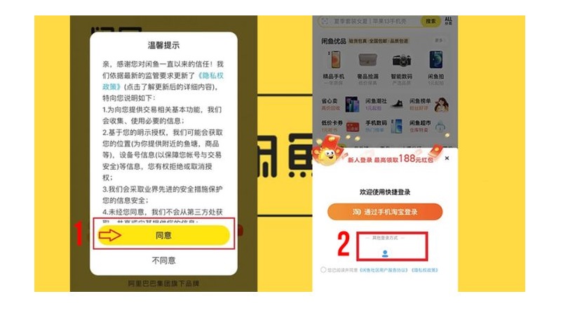 Tại giao diện đăng nhập, hãy chọn tùy chọn sử dụng tài khoản Taobao. Đồng ý với các điều khoản và nhấn vào nút để kết nối Xianyu với tài khoản Taobao của bạn.